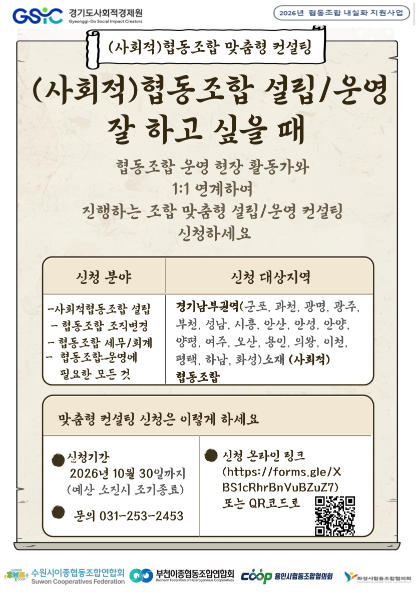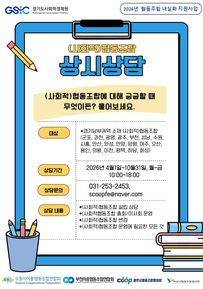 - 「2026년 협동조합 내실화 지원사업」사회적협동조합 상시상담·컨설팅 안내의 건 1.pdf (389.2K) 9회 다운로드 | DATE : 2026-04-16 16:14:47