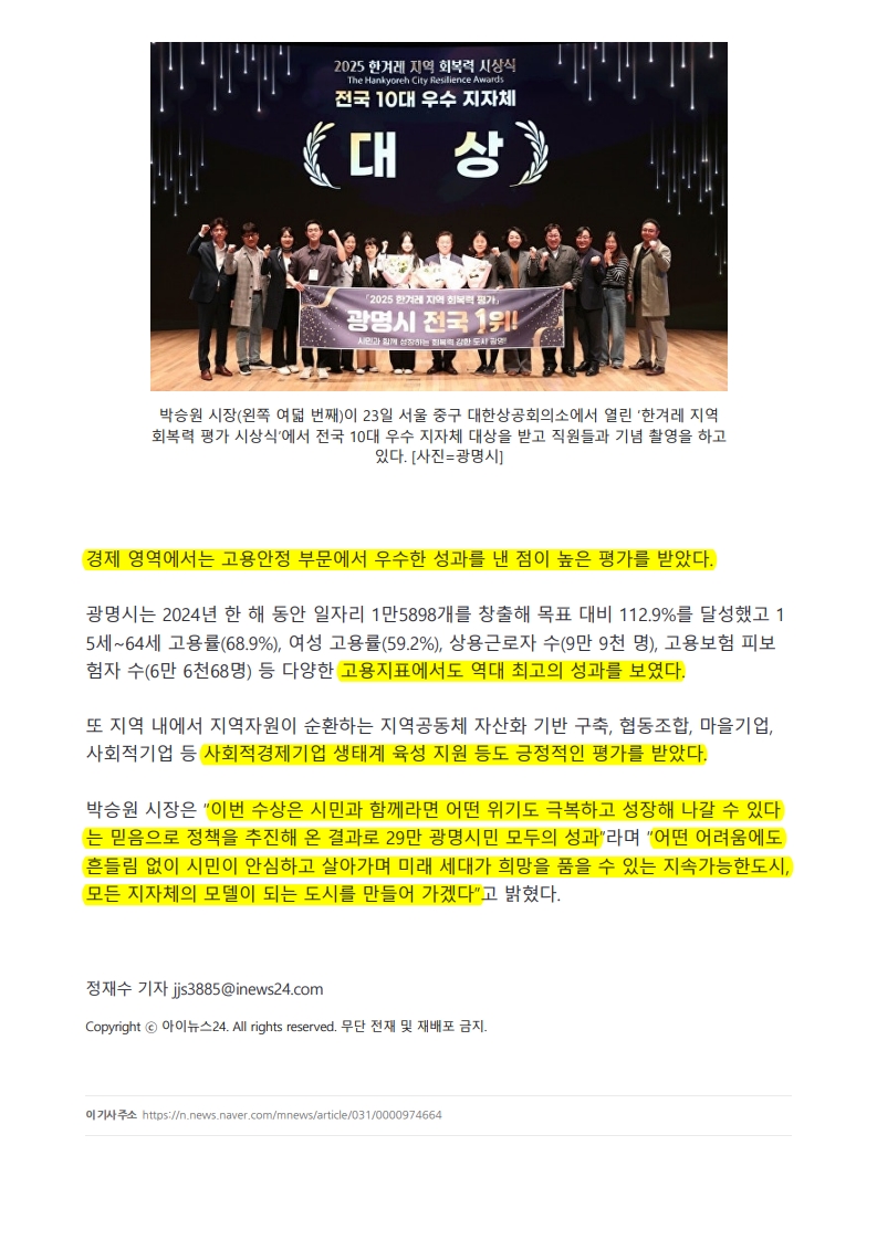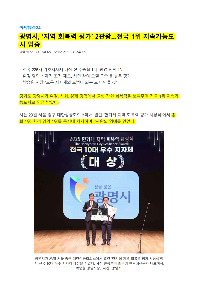 광명시, ‘지역 회복력 평가’ 2관왕…전국 1위 지속가능도 시 입증 페이지 정보 작성자 최고관리자 댓글 0건 조회 69회 작성일25-10-24 10:32 본문 . 댓글목록 댓글목록 등록된 댓글이 없습니다. 목록