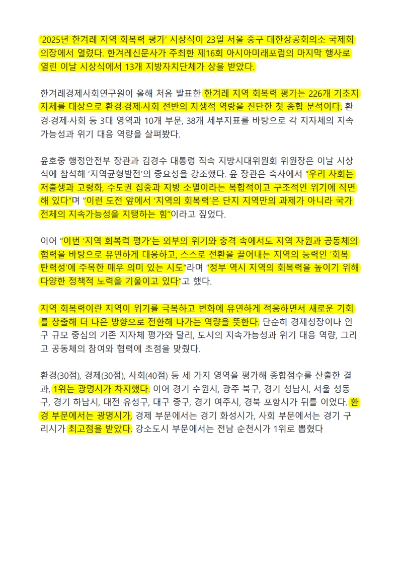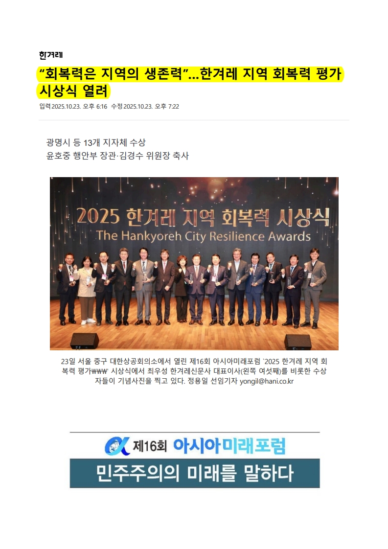 “회복력은 지역의 생존력”…한겨레 지역 회복력 평가 시상식 열려 페이지 정보 작성자 최고관리자 댓글 0건 조회 66회 작성일25-10-24 10:32 본문 . 댓글목록 댓글목록 등록된 댓글이 없습니다. 목록