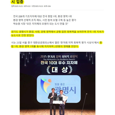광명시, ‘지역 회복력 평가’ 2관왕…전국 1위 지속가능도 시 입증