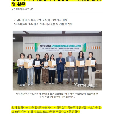 광명시, 사회적경제 특화 컨설팅 수료…62명 중 51명 완주