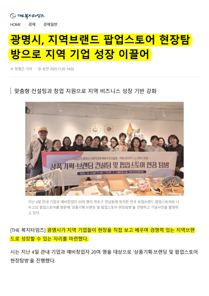 광명시, 지역브랜드 팝업스토어 현장탐 방으로 지역 기업 성장 이끌어 페이지 정보 작성자 최고관리자 댓글 0건 조회 48회 작성일25-11-06 14:37 본문 댓글목록 댓글목록 등록된 댓글이 없습니다. 목록