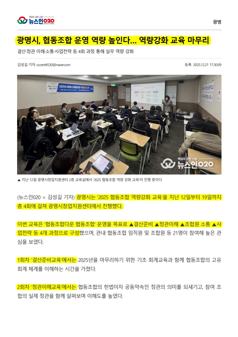 광명시, 협동조합 운영 역량 높인다… 역량강화 교육 마무리 페이지 정보 작성자 최고관리자 댓글 0건 조회 23회 작성일26-01-05 11:34 본문 . 댓글목록 댓글목록 등록된 댓글이 없습니다. 목록