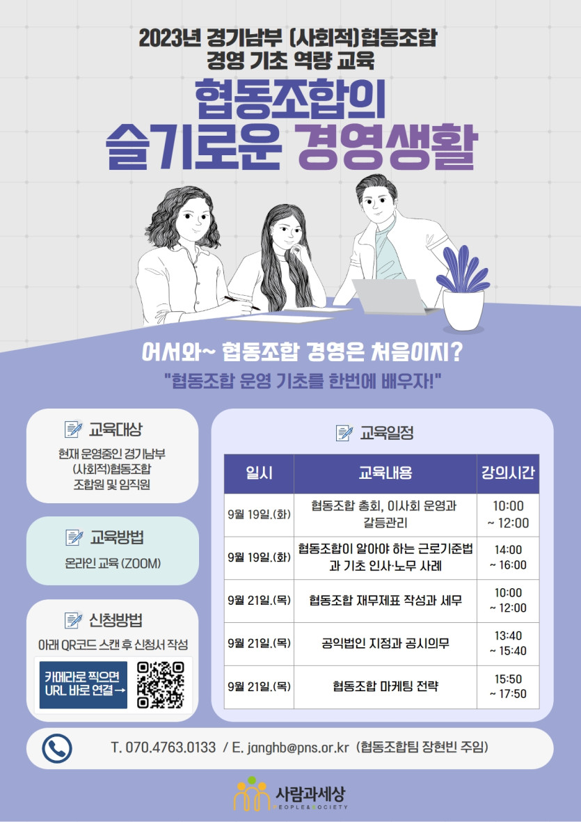 사람과세상에서 경기남부 (사회적)협동조합 조합원 및 임직원분들 대상으로 경영에 필요한 기초 지식과 실무 역량 강화 교육을 실시한다고 합니다.