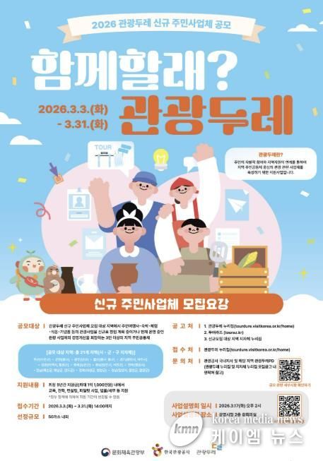 '우리동네 맛집·체험을 관광 코스로!' 광명 관광 이끌 '관광두레' 주민 공동체 모집 페이지 정보 작성자 최고관리자 댓글 0건 조회 23회 작성일26-03-12 10:02 본문 댓글목록 댓글목록 등록된 댓글이 없습니다. 목록